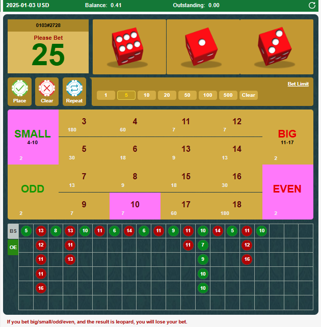– លក្ខណៈពិសេសគឺ រាល់ពេលយើងចាក់ big/small/odd/even ហើយវាចេញរូប3ដូចគ្នាអ្នកចាក់ត្រូវចាញ់